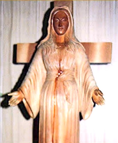N.Dame d’Akita utilise une statue pour exprimer ses sentiments de douleur avec des signes, que tous les malentendants spirituels que nous sommes, peuvent voir.